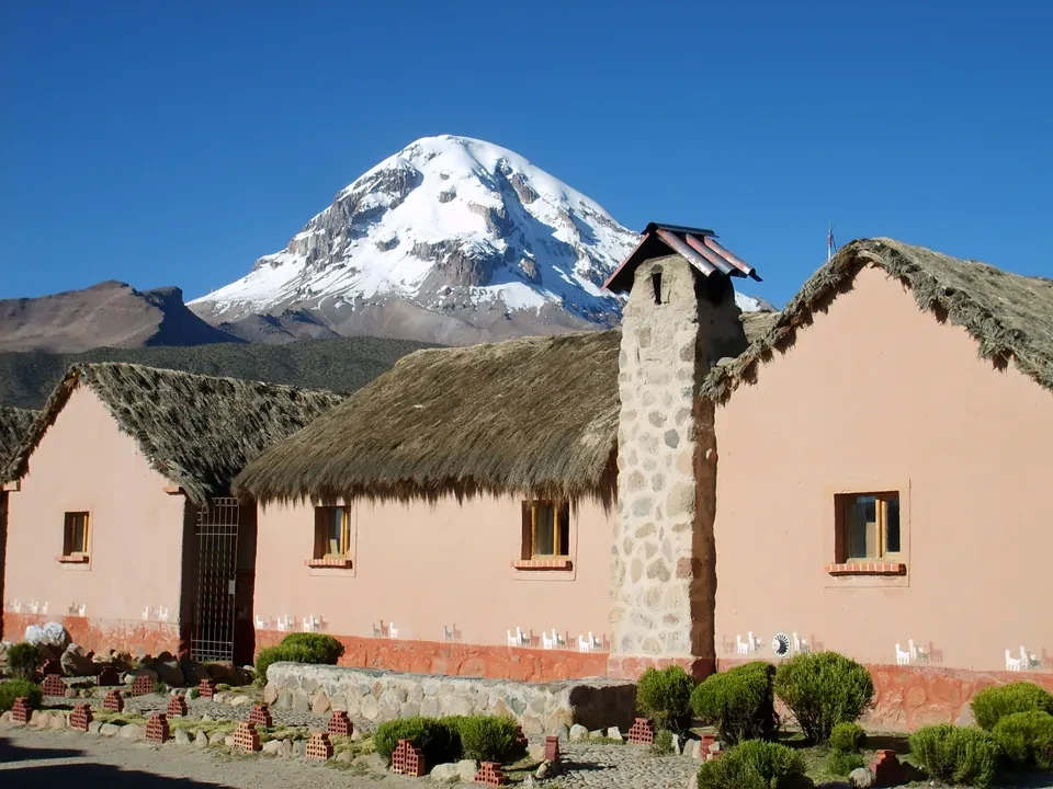 Visite du parc national Sajama, où se trouve le volcan Sajama, le plus haut de Bolivie avec 6 542 m d'altitude. Randonnées à travers des forêts de queñua, des geysers, des lagunes Khasiri et Sorapata. Aussi les chullpas polychromes du Río Lauca.