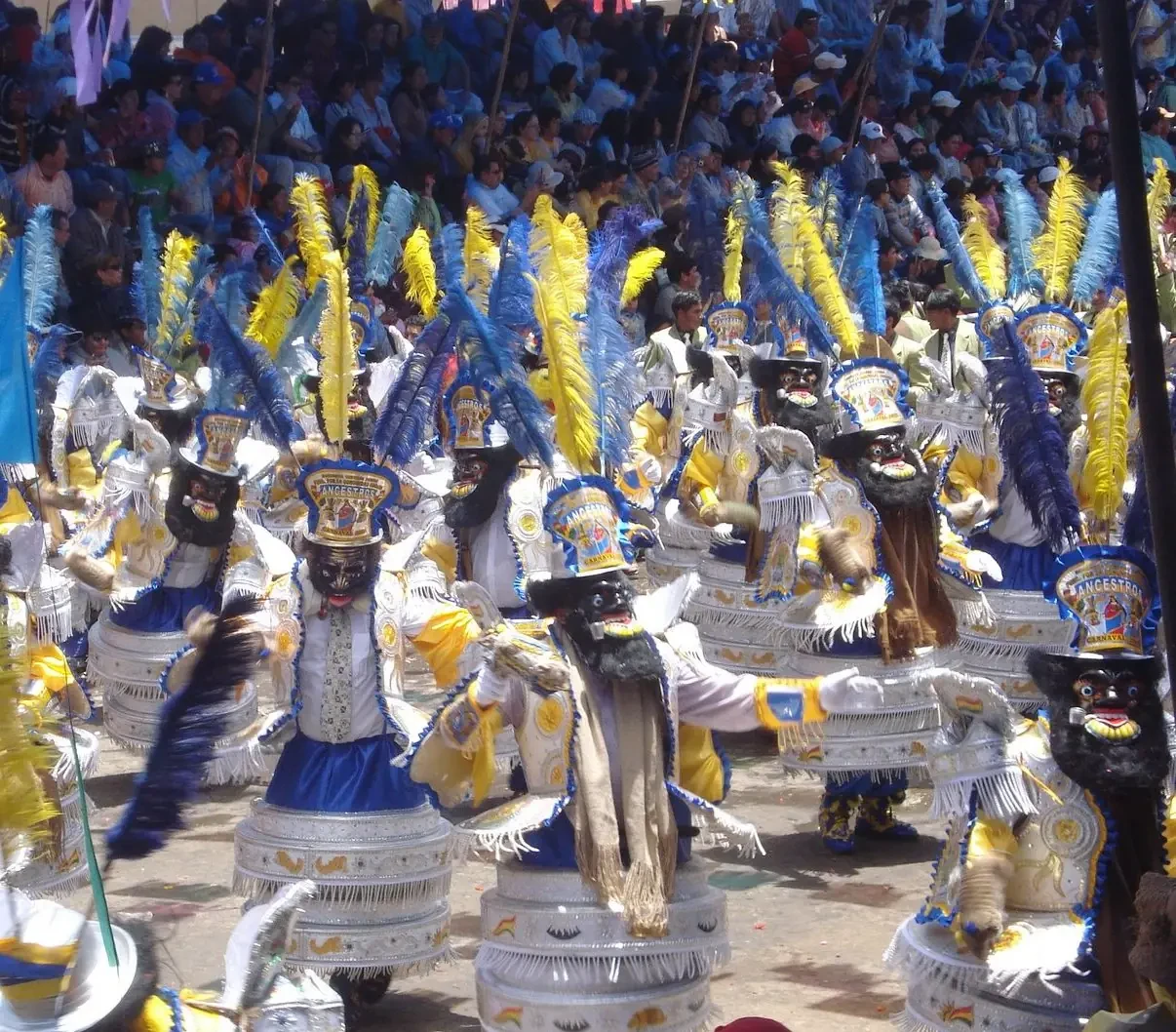 They are characterized by the costumes and the slow rhythm of the choreography. In the attire, the ostentatious design stands out, the making of the cape and the mask in men, the shawls and the skirts in women. The presence of the cholas is an important component, as they parade with pride and gallantry alongside the troop of morenos who advance to the rhythm of the matraca (a handheld idiophone musical instrument), guided by the achachi galán.