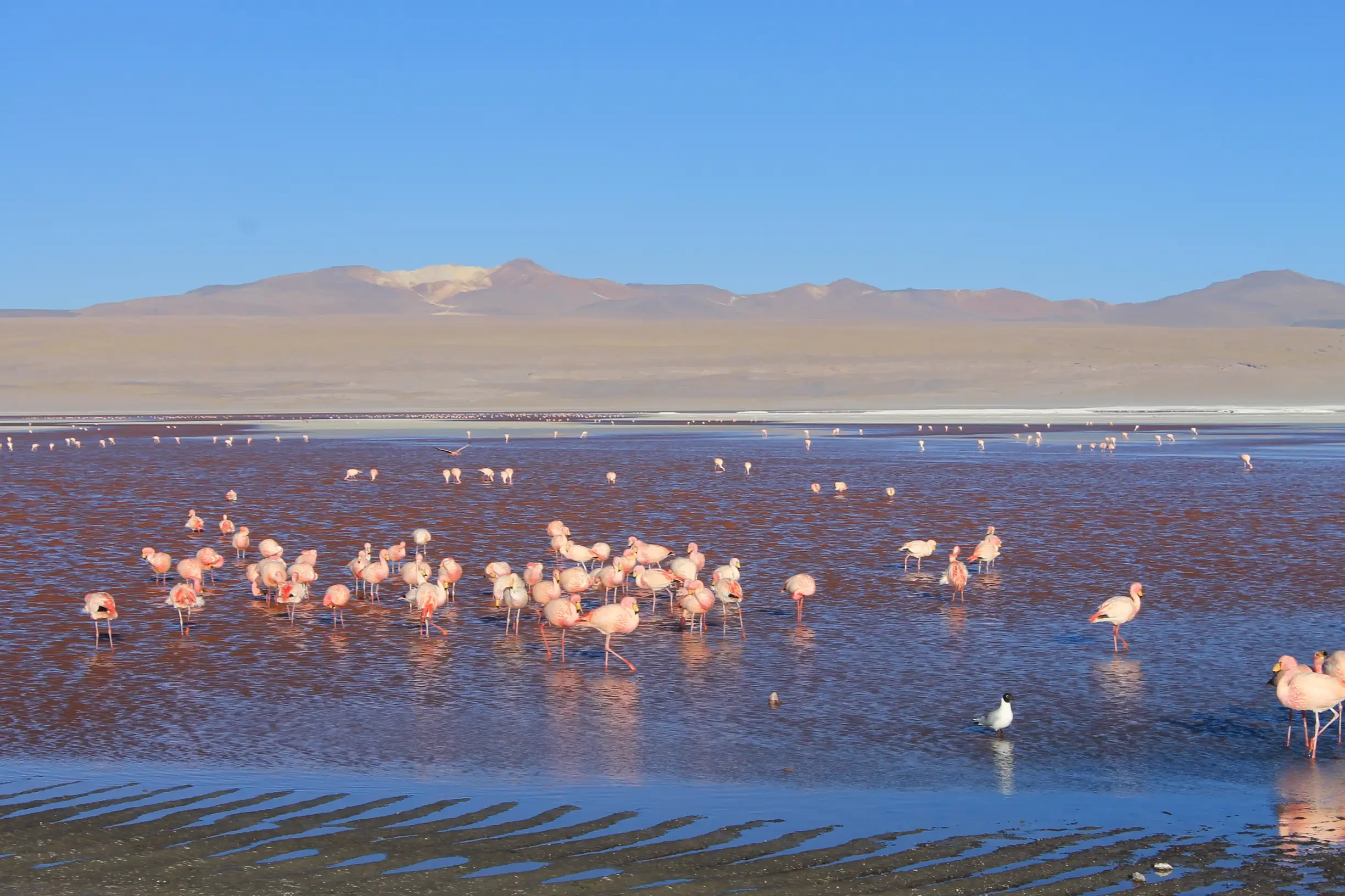 • Then we begin the visit to Laguna Colorada, which especially in winter has reddish waters due to the presence of plankton, microscopic flagellated algae of the Dunaliella salina species.