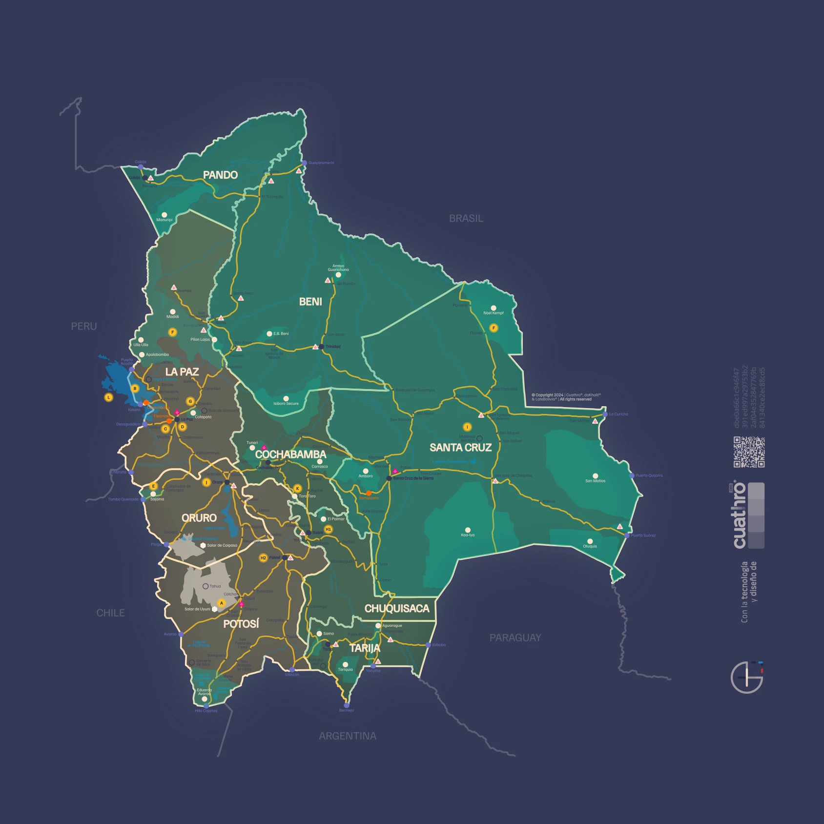The most iconic destinations in Bolivia combine urban culture, sacred lakes, salt deserts, Amazonian jungles, and snow-capped peaks: the vibrant capital La Paz, located at 3,600 m a.s.l. and famous for its historic district and cable cars that connect the city with the surrounding hills; Lake Titicaca, the highest navigable lake in the world (3,812 m a.s.l.) that separates Bolivia and Peru and houses floating communities of the Uros; the Salar de Uyuni, the largest salt flat on the planet (≈ 3,656 m a.s.l.) with more than 10,000 km² of surface that transforms into a water mirror after rains; the Madidi National Park, an Amazonian reserve of ≈ 18,958 km² that protects more than 3% of higher plant species and 3.75% of the planet's vertebrates, becoming one of the most biodiverse protected areas in the world; and Mount Chacaltaya, which reaches 5,421 m a.s.l., was the site of the world's highest ski resort and today preserves the high-atmosphere laboratory and the highest restaurant recorded by Guinness. Each of these places offers unique experiences, from pre-Columbian history and local craftsmanship to otherworldly landscapes and adventure opportunities in the Andes.